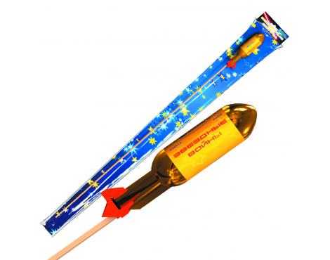 Мощнейшая ракета в отдельной упаковке. Множество золотых ниспадающих нитями звезд (парча), красное мерцание и белый мерцающий центр.